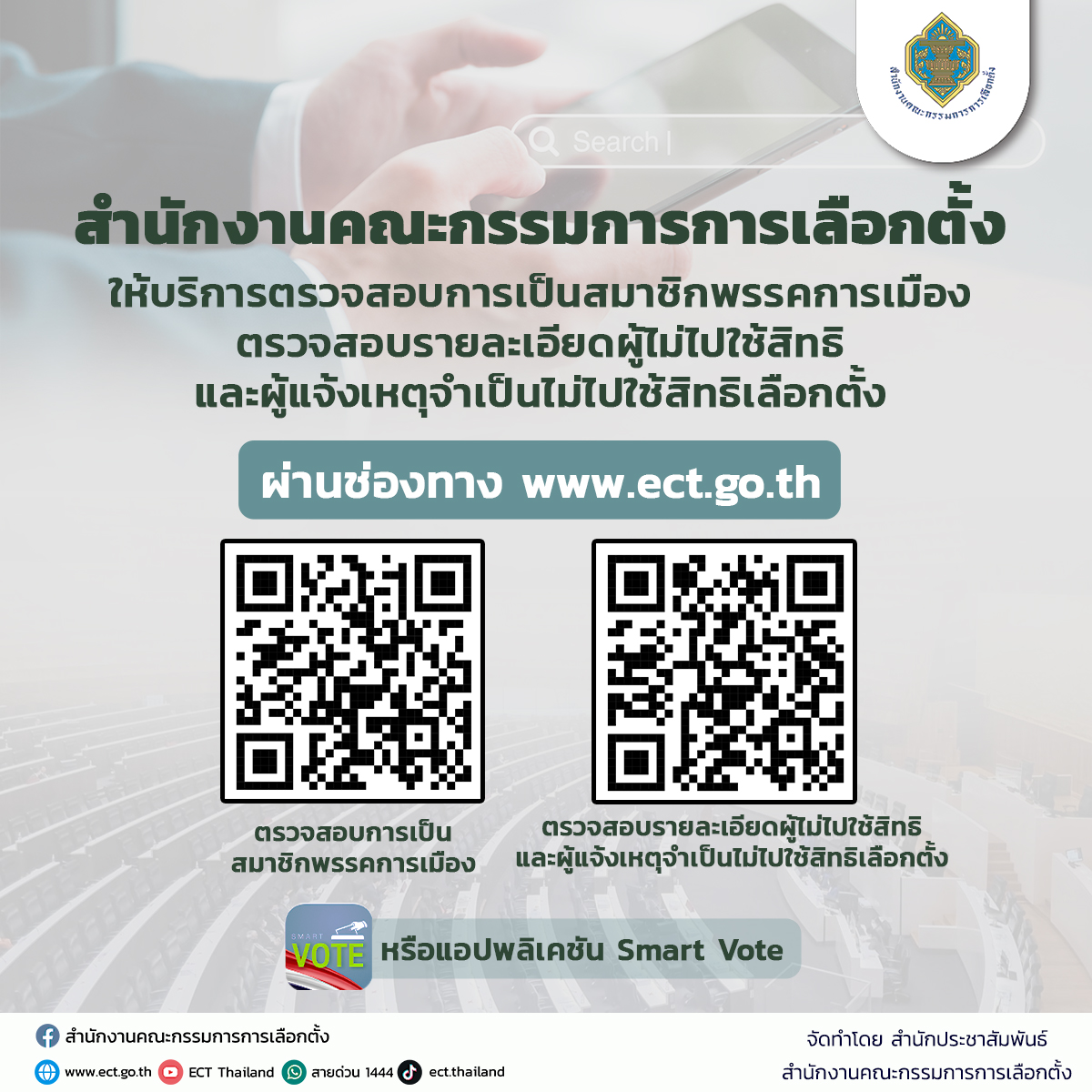 ประชาสัมพันธ์การให้บริการตรวจสอบการเป็นสมาชิกพรรคการเมอง และตรวจสอบรายละเอียดผู้ไม่ไปใช้สิทธิและผู้แจ้งเหตุจำเป็นไม่ไปใช้สิทธิเลือกตั้ง